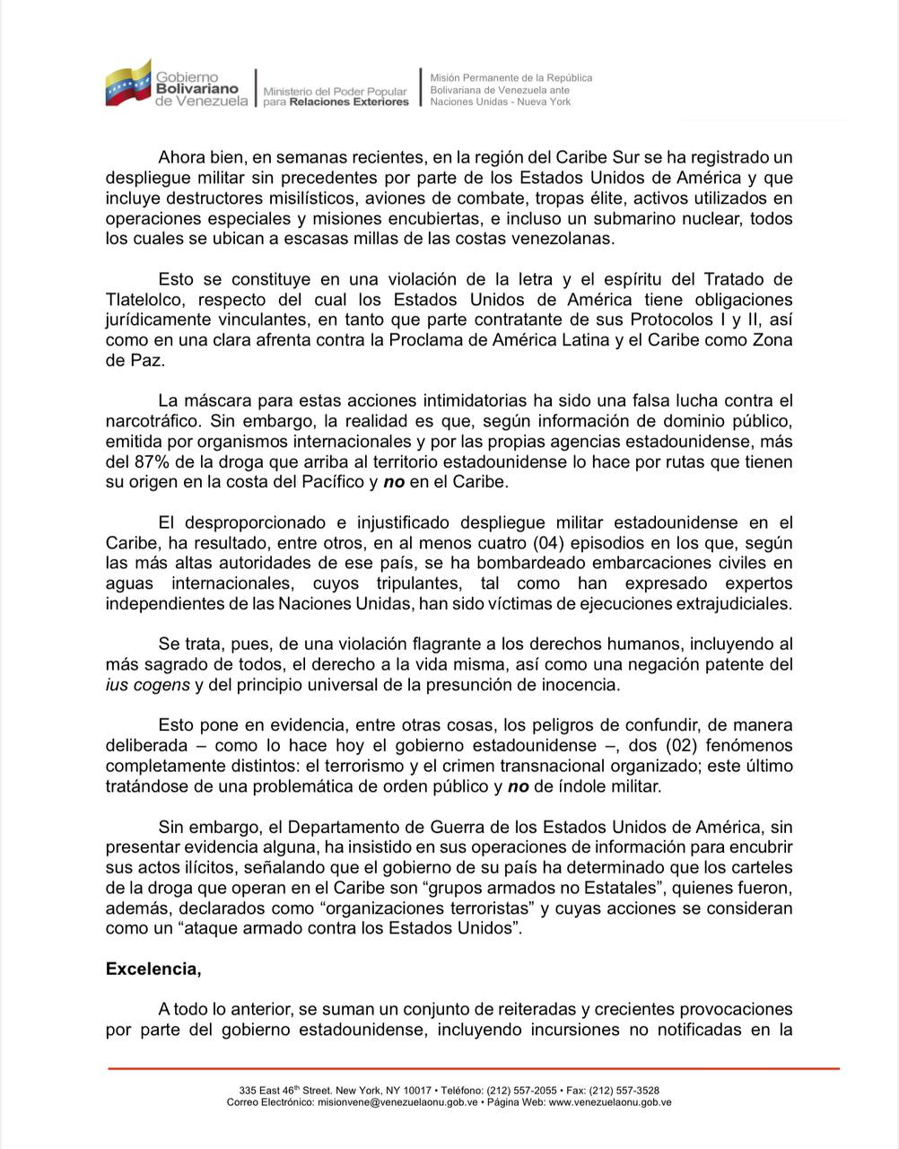 La misiva denuncia el despliegue cercano a las costas venezolanas de «destructores misilísticos, aviones de combate, tropas élite, activos utilizados en operaciones especiales y misiones encubiertas, e incluso un submarino nuclear». Según el régimen chavista, estas acciones violan la proclamación de América Latina y el Caribe como Zona de Paz.