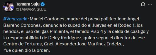 La mujer denunció que fue reactivada un área de aislamiento dentro del recinto penitenciario, conocida como el “piso 4”, donde, según su testimonio, los reclusos son castigados, desnudados y sometidos a condiciones de presión psicológica. Además, indicó que el director del centro de torturas, el coronel Alexander José Martínez Endeiza, amenazó a los privados de libertad y dijo que era «una orden de Delcy Rodríguez».