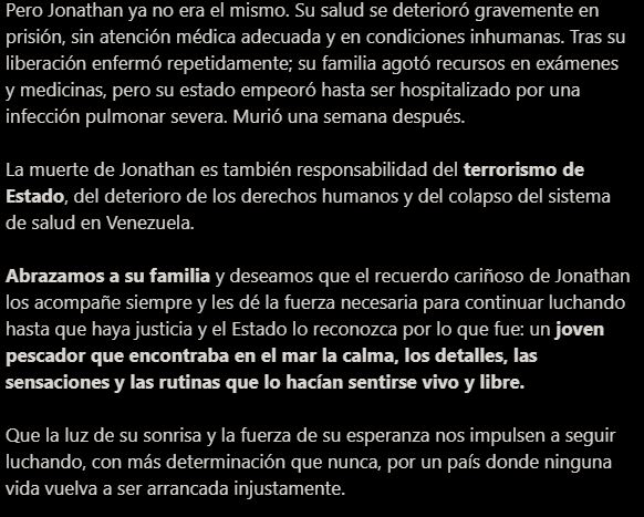 El Comité por la Libertad de los Presos Políticos de Venezuela (Clippve) informó este sábado que Jonathan Rodríguez, joven pescador de 30 años y ex preso político, falleció en horas de la noche del viernes 21 de noviembre tras un grave deterioro de su salud, provocado —según denuncia la organización— por su detención arbitraria y las condiciones inhumanas a las que fue sometido.