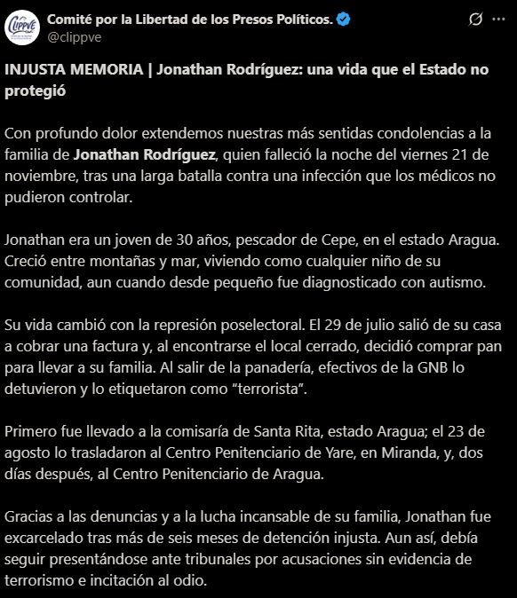 El Comité por la Libertad de los Presos Políticos de Venezuela (Clippve) informó este sábado que Jonathan Rodríguez, joven pescador de 30 años y ex preso político, falleció en horas de la noche del viernes 21 de noviembre tras un grave deterioro de su salud, provocado —según denuncia la organización— por su detención arbitraria y las condiciones inhumanas a las que fue sometido.