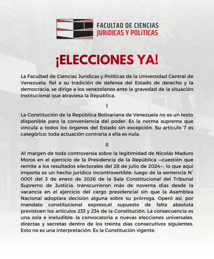 La Facultad de Ciencias Jurídicas y Políticas de la Universidad Central de Venezuela (UCV) exigió este lunes la celebración inmediata de elecciones presidenciales luego de que se concretara la ausencia absoluta en el Palacio de Miraflores a más de tres meses de la captura de Nicolás Maduro a manos de Estados Unidos.