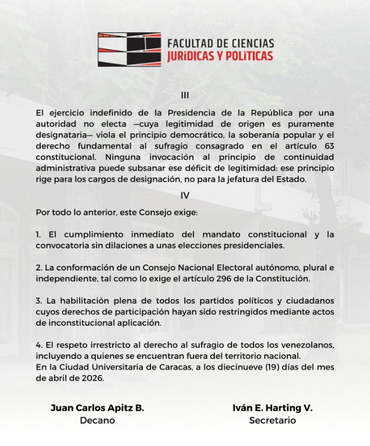 En un comunicado, firmado por el decano Juan Carlos Apitz y el secretario Iván Harting, la facultad solicitó elecciones después de la conformación de un Consejo Nacional Electoral (CNE) autónomo, plural e independiente.