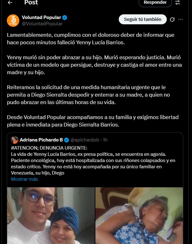 Según el mensaje, Barrios falleció tras una larga enfermedad, sin poder reencontrarse con su hijo, también privado de libertad. El partido reiteró la solicitud de una medida humanitaria urgente que permita a Diego Sierralta despedir y enterrar a su madre.