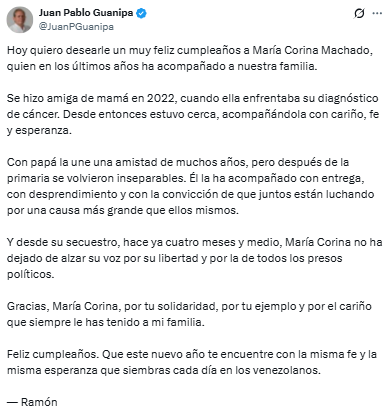 «Gracias, María Corina, por tu solidaridad, por tu ejemplo y por el cariño que siempre le has tenido a mi familia. Feliz cumpleaños. Que este nuevo año te encuentre con la misma fe y la misma esperanza que siembras cada día en los venezolanos. — Ramón».