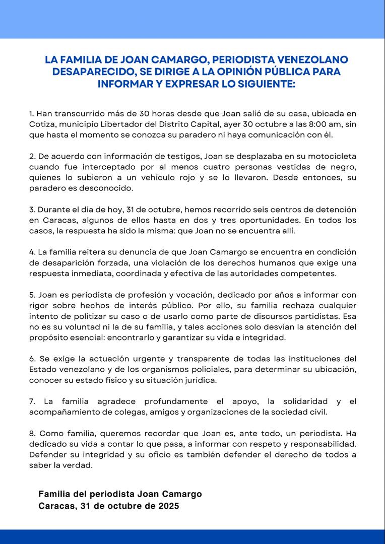 En el comunicado, la familia recordó que Joan Camargo es periodista de profesión y vocación, con años de experiencia en la cobertura de hechos noticiosos.