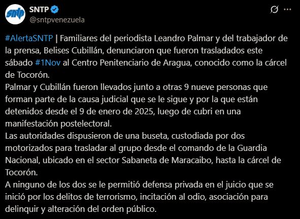 El Sindicato Nacional de Trabajadores de la Prensa de Venezuela (Sntp) denunció que el periodista Leandro Palmar y su compañero fotógrafo y videógrafo, Belices Cubillán, fueron trasladados este sábado al Centro Penitenciario de Aragua, también conocido como la cárcel de Tocorón.