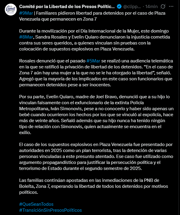 Familiares de personas detenidas por el caso de los supuestos explosivos en Plaza Venezuela exigieron su liberación durante una movilización realizada el domingo 8 de marzo en Caracas, en el marco del Día Internacional de la Mujer, según denunció el Comité por la Libertad de los Presos Políticos (Clippve) en su cuenta oficial en la red social X.