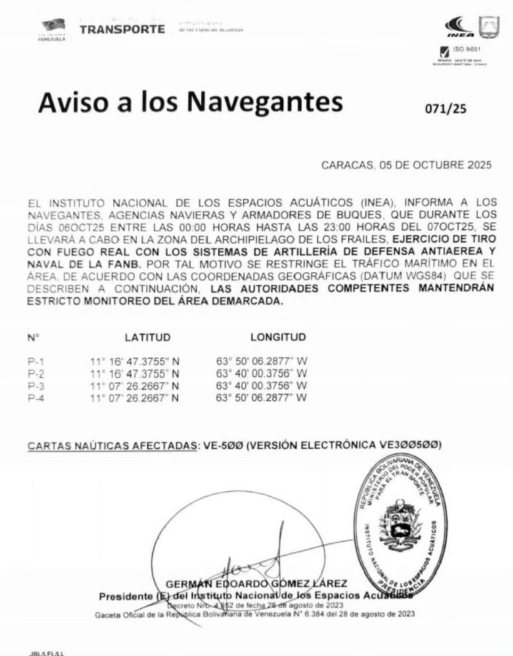 Germán Edoardo Gómez Lárez, presidente del Inea, emitió el pasado domingo el aviso 071/25 para que navegantes, agencias navieras y armadores de buques mantuvieran distancia de la Península de Macanao, en el estado Nueva Esparta, y el Archipiélago de Los Frailes, compuesto por más de 10 islas en las Dependencias Federales.