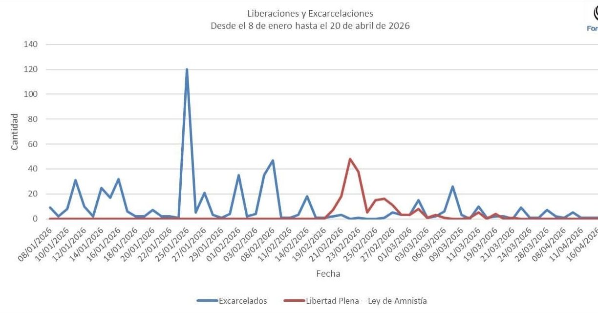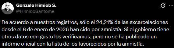 Gonzalo Himiob, director vicepresidente de la organización, señaló en un mensaje en X que por la amnistía se han producido solo el 24,21 % de las excarcelaciones ocurridas desde el pasado 8 de enero, cuando se anunció un proceso de liberaciones.