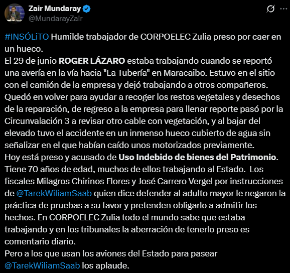«Humilde trabajador de Corpoelec Zulia preso por caer en un hueco. El 29 de junio Roger Lázaro estaba trabajando cuando se reportó una avería en la vía hacia ‘La Tubería’», informó en redes sociales el abogado Zair Mundaray.