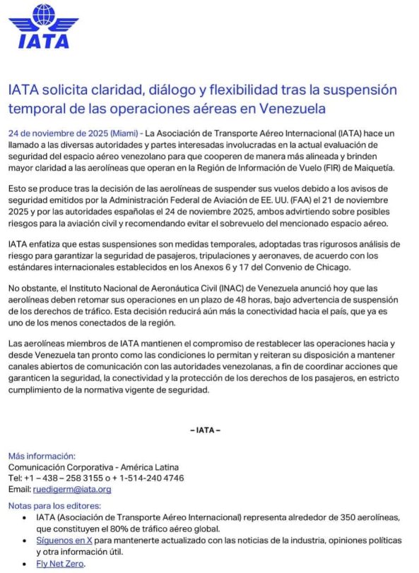 La Asociación Internacional del Transporte Aéreo (IATA), que engloba a 300 líneas aéreas de todo el mundo, aclaró que las compañías que podrían perder sus derechos de tráfico en Venezuela, tras recibir una advertencia del Instituto Nacional de Aeronáutica Civil (INAC), son las que han suspendido sus vuelos.