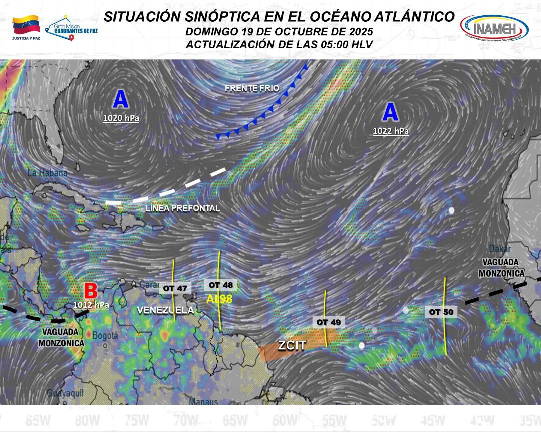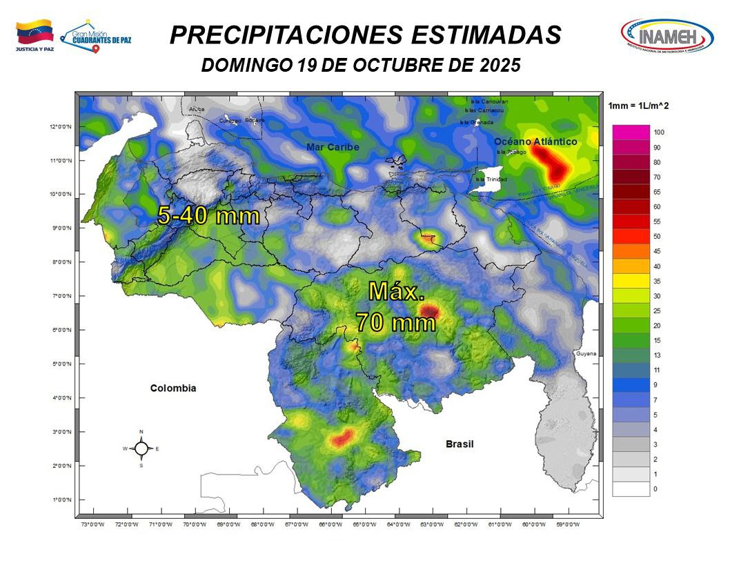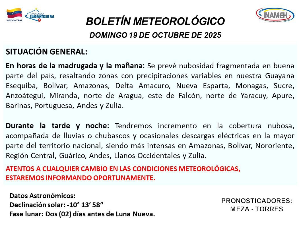 El Instituto Nacional de Meteorología e Hidrología (INAMEH) informó que este domingo 18 de octubre Venezuela amanece con nubosidad fragmentada en buena parte del territorio, con zonas donde ya se registran lluvias tempranas y actividad eléctrica, especialmente en nuestra Guayana Esequiba, Bolívar, Amazonas, Delta Amacuro, Monagas, Sucre, este de Miranda, norte de Yaracuy, este de Falcón, sur de Cojedes, Barinas, Apure, norte de Mérida y el eje del Lago de Maracaibo.