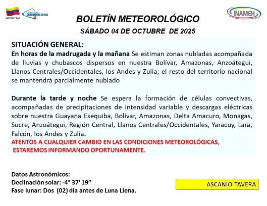 El Instituto Nacional de MeteorologÃa e HidrologÃa (Inameh) informó en su reporte de este sábado 4 de octubre que buena parte del paÃs amaneció con nubosidad parcial, mientras que en regiones como BolÃvar, Amazonas, Anzoátegui, Llanos Centrales y Occidentales, los Andes y Zulia se registran áreas nubladas con lluvias y chubascos dispersos, algunos acompañados de descargas eléctricas.