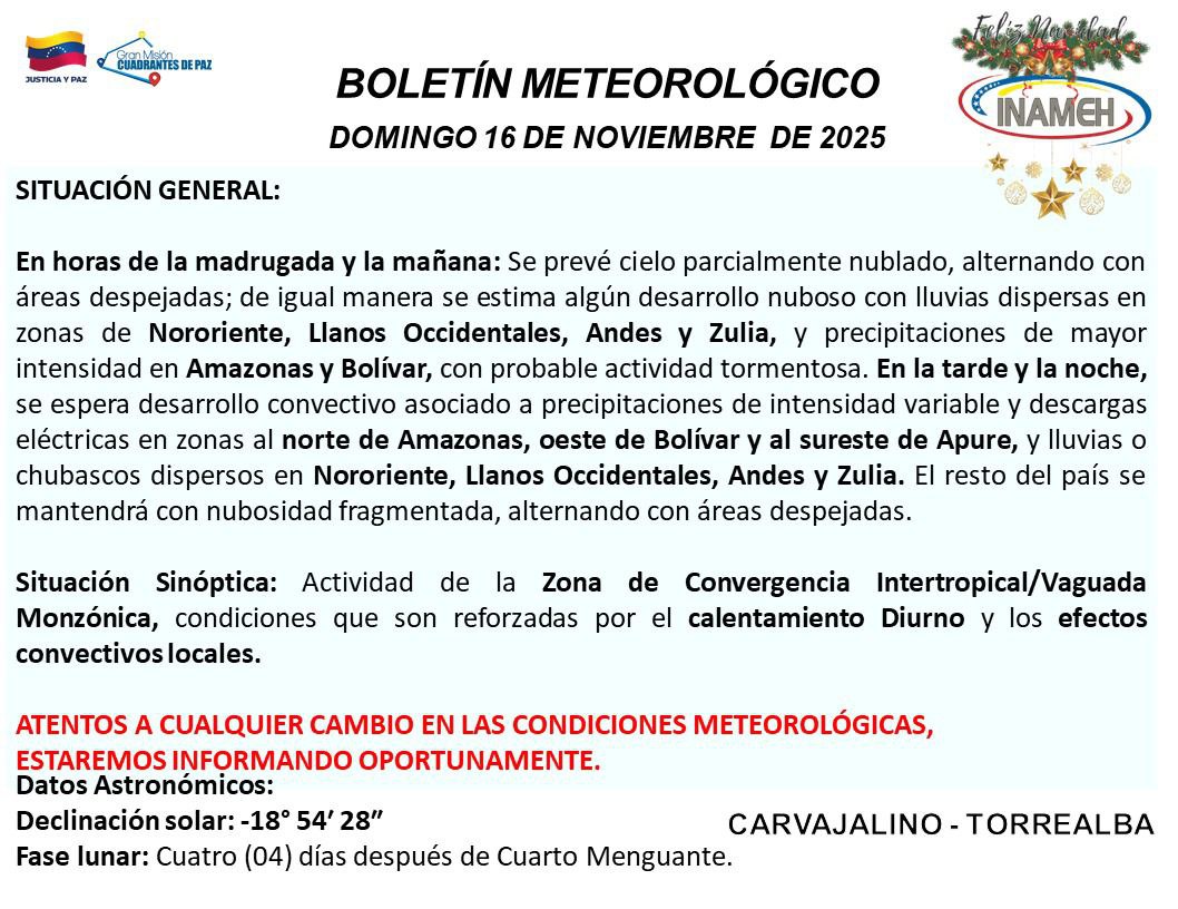 El Instituto Nacional de Meteorología e Hidrología (Inameh) informó que este domingo 16 de noviembre Venezuela amanece bajo un patrón de cielo parcialmente nublado, alternando con áreas despejadas en buena parte del territorio nacional.