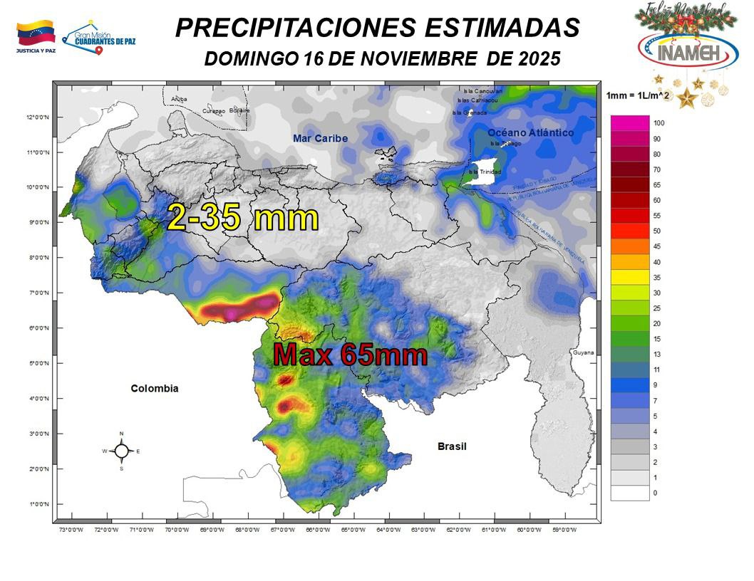 El panorama es más inestable hacia el sur. De acuerdo con el reporte, en Amazonas y Bolívar se esperan lluvias de variada intensidad, algunas acompañadas de actividad eléctrica, debido al desarrollo de nubes convectivas típico de la región.