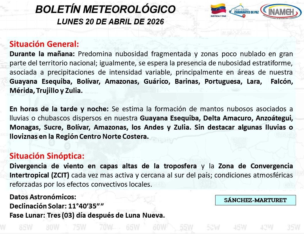 Para las horas de la tarde y noche, el pronóstico indica un incremento en la formación de núcleos nubosos asociados a lluvias o chubascos dispersos, especialmente en la región de los Andes, Zulia, Delta Amacuro, Anzoátegui, Monagas y Sucre, además de las entidades del sur y la zona en reclamación.