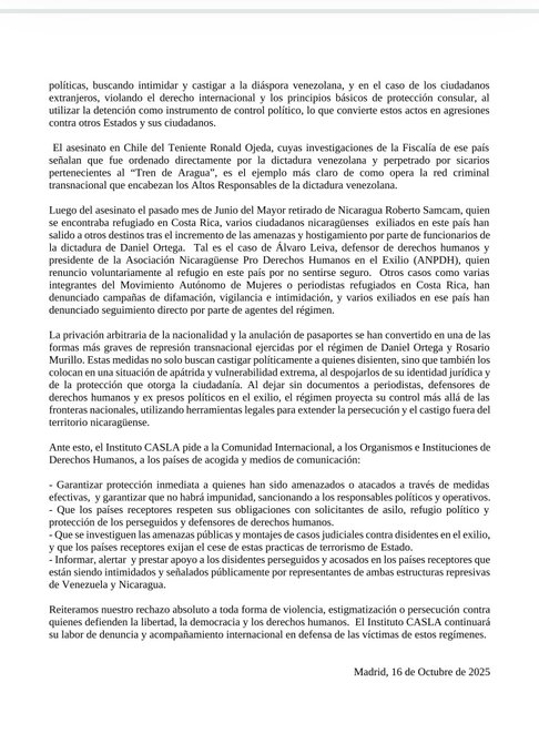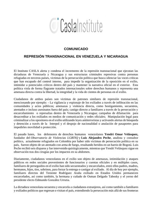 El Instituto Casla emitió un comunicado este jueves donde denuncia el aumento de la represión transnacional perpetrada por los regímenes de Nicolás Maduro y Daniel Ortega en Venezuela y Nicaragua, respectivamente.