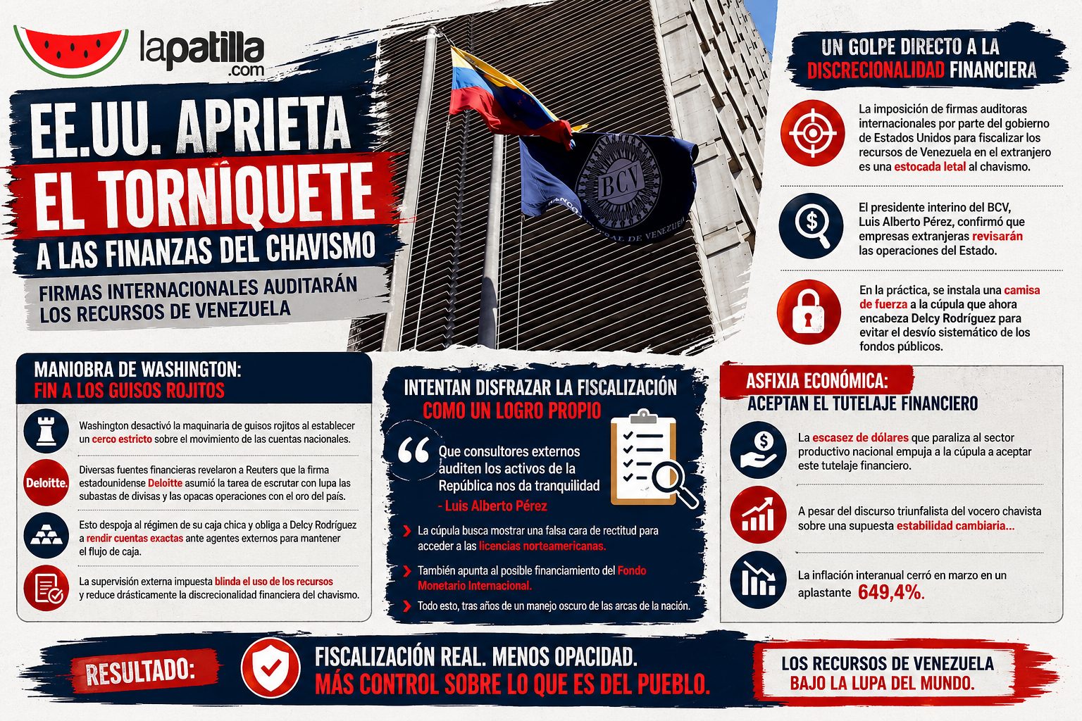 La maniobra de Washington desactivó la maquinaria de guisos rojitos al establecer un cerco estricto sobre el movimiento de las cuentas nacionales. Diversas fuentes financieras revelaron a Reuters que la firma estadounidense Deloitte asumió la tarea de escrutar con lupa las subastas de divisas y las opacas operaciones con el oro del país, despojando al régimen de su caja chica y obligando a la sucesora de Nicolás Maduro a rendir cuentas exactas ante agentes externos para mantener el flujo de caja.
