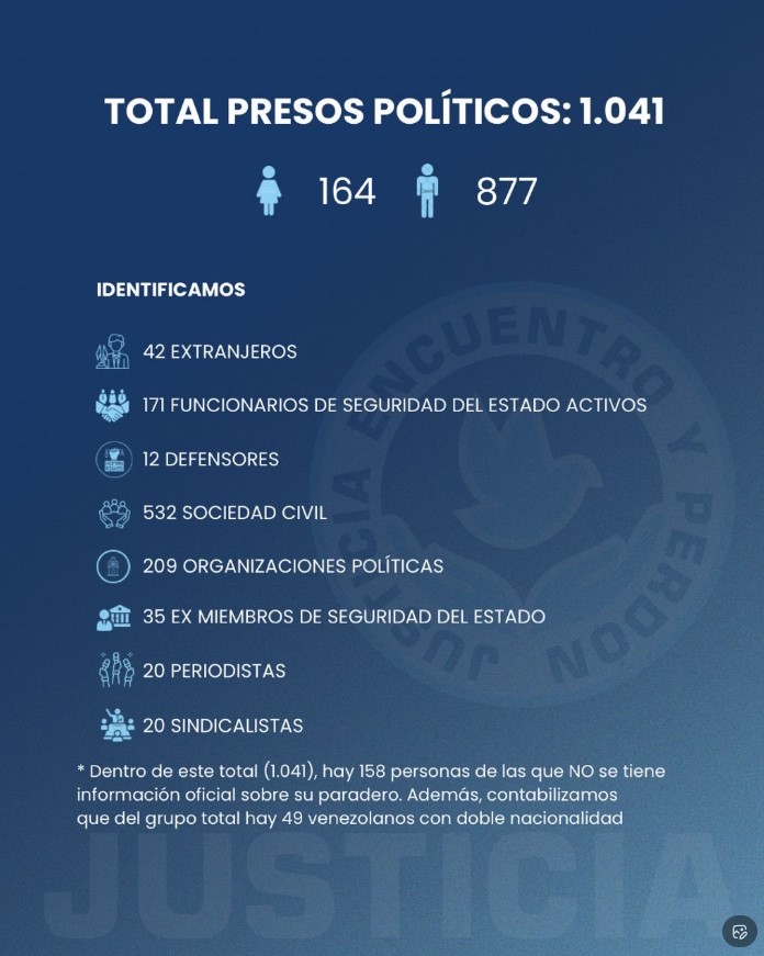 Actualmente, Justicia Encuentro y Perdón documenta 1.041 presos políticos en Venezuela, una cifra que, según advierte la organización, podría ser incluso mayor. El hallazgo constante de detenciones desconocidas demuestra que la magnitud de la crisis de derechos humanos sigue siendo un “objetivo en movimiento”, donde las excarcelaciones no representan una solución estructural.