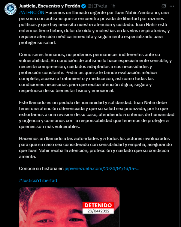 La ONG Justicia Encuentro y Perdón lanzó un llamado urgente en su cuenta oficial de X sobre la situación de Juan Nahir Zambrano, una persona con autismo que se encuentra actualmente privada de libertad en Yare II, por razones políticas.