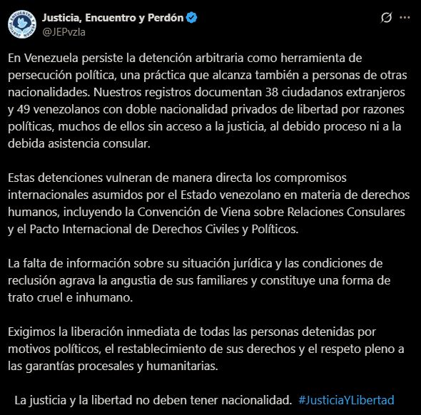La ONG Justicia, Encuentro y Perdón (JEP) denunció este martes que en Venezuela persiste la detención arbitraria como herramienta de persecución política, tras documentar que 38 extranjeros y 49 venezolanos con doble nacionalidad han sido privados de libertad por motivos políticos, muchos de ellos sin acceso a la justicia, el debido proceso o a la asistencia consular.