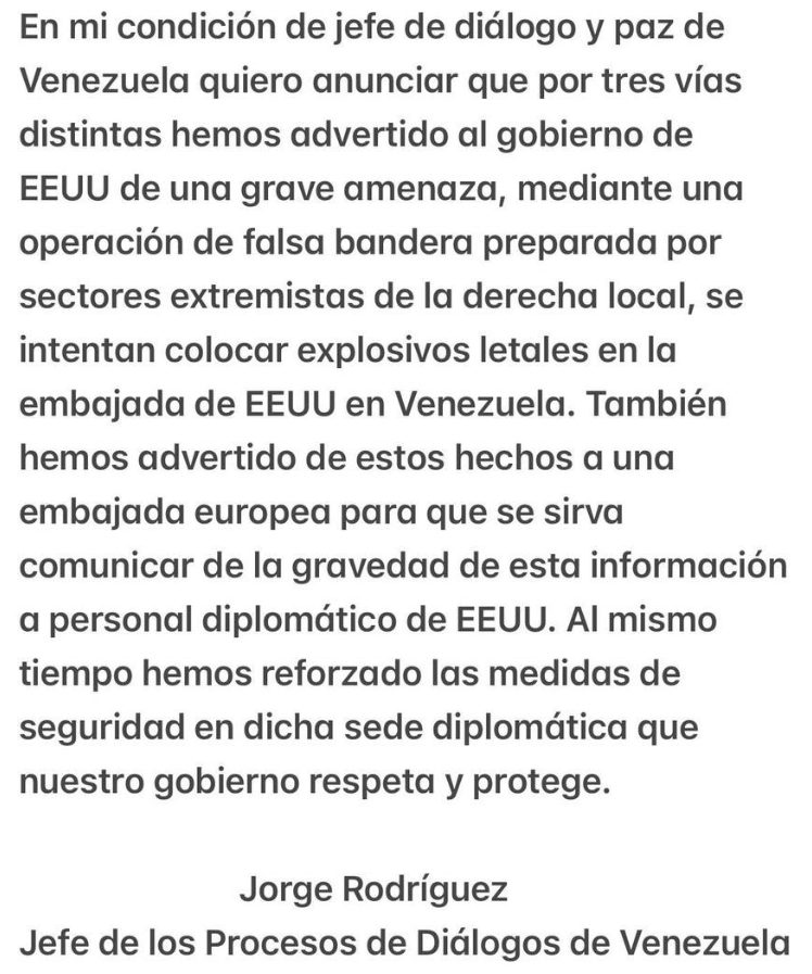 Jorge Rodríguez informó este domingo que, por «tres vías distintas», advirtió a Estados Unidos de un supuesto plan de «sectores extremistas de la derecha local» para poner «explosivos letales» en la embajada del país norteamericano en Caracas, como parte, señaló, de una «operación de falsa bandera».