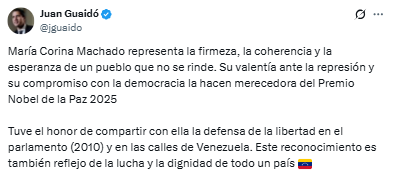 Juan Guaidó felicitó a María Corina Machado tras su elección como ganadora del Premio Nobel de la Paz 2025.