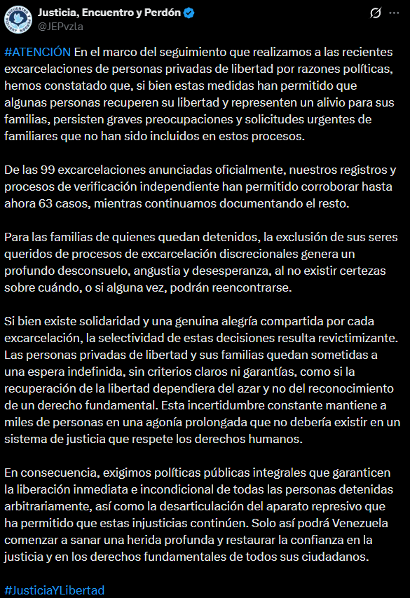 «En el marco del seguimiento que realizamos a las recientes excarcelaciones de personas privadas de libertad por razones políticas, hemos constatado que, si bien estas medidas han permitido que algunas personas recuperen su libertad y representen un alivio para sus familias, persisten graves preocupaciones y solicitudes urgentes de familiares que no han sido incluidos en estos procesos», subrayó Justicia, Encuentro y Perdón en sus redes sociales.