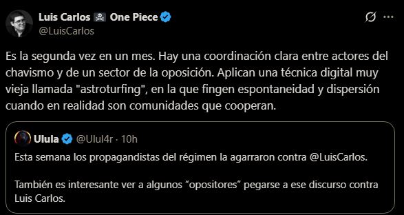 “Es la segunda vez en un mes. Hay una coordinación clara entre actores del chavismo y de un sector de la oposición. Aplican una técnica digital muy vieja llamada ‘astroturfing’, en la que fingen espontaneidad y dispersión cuando en realidad son comunidades que cooperan”, escribió Díaz.