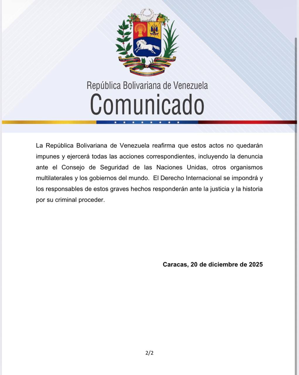 El régimen de Nicolás Maduro emitió un comunicado oficial este sábado 20 de diciembre en el que denunció y rechazó lo que calificó como el «robo y secuestro» de un buque privado que transportaba crudo venezolano en aguas internacionales. El chavismo acusó directamente a efectivos militares de los Estados Unidos de ejecutar esta acción, la cual incluyó la «desaparición forzada de su tripulación».