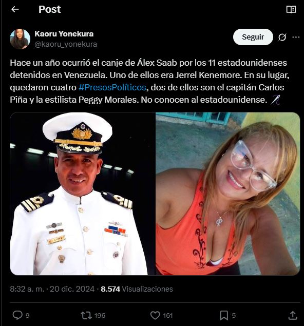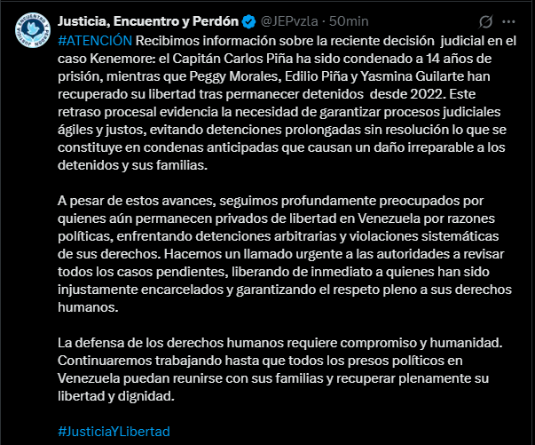 A través de su cuenta oficial en X, la organización informó que el capitán Carlos Piña fue condenado a 14 años de prisión, mientras que Peggy Morales, Edilio Piña y Yasmina Guilarte recuperaron su libertad después de permanecer detenidos durante más de dos años sin sentencia.