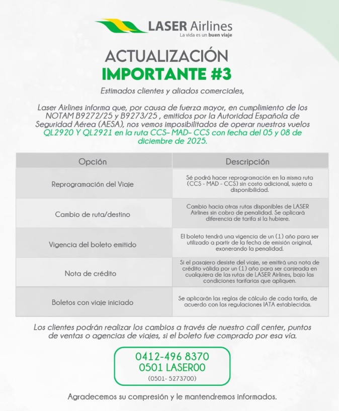 «En cumplimiento de los NOTAM (avisos en el argot aeronáutico) B9272/25 y B9273/25 emitidos por la Autoridad Española de Seguridad Aérea (AESA), nos vemos imposibilitados de operar nuestros vuelos QL2920 y QL2921 CCS-MAD-CCS con fecha del 5 y 8 de diciembre de 2025», precisó Laser en un comunicado actualizado en Instagram.