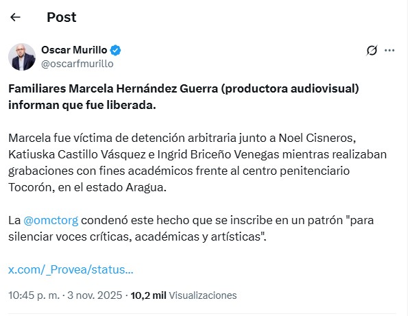 Los cineastas venezolanos Noel Cisneros, Katiuska Castillo, Ingrid Briceño y Marcela Hernández fueron liberados este lunes tras permanecer detenidos de forma «arbitraria» desde el viernes, tiempo durante el cual se desconoció su paradero, dijo a EFE el coordinador general de la ONG Provea, Óscar Murillo, quien advirtió que este caso «sienta un grave precedente» en el país.