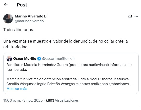 En la red social X, el abogado Marino Alvarado, coordinador de Exigibilidad Legal de Provea, destacó «el valor de la denuncia, de no callar ante la arbitrariedad», y el Comité por la Libertad de los Luchadores Sociales dijo que «la presión nacional e internacional logró que Noel, Ingrid, Katiuska y Marcela estén con sus familiares y amigos».