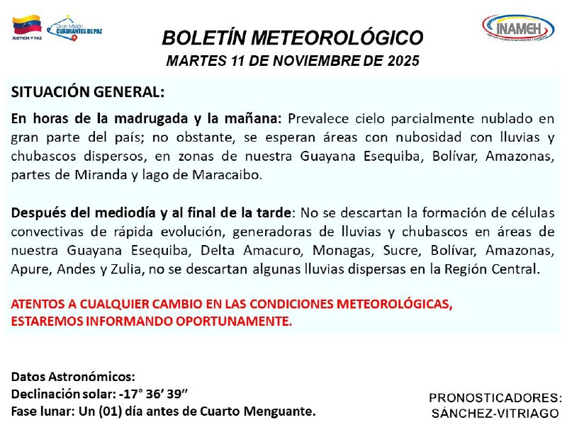 El Instituto Nacional de MeteorologÃa e HidrologÃa (Inameh) informó este martes, 11 de noviembre de 2025, que aunque la mañana se ha mantenido con cielo parcialmente nublado en gran parte del territorio nacional, se esperan áreas con lluvias y chubascos dispersos en varias zonas del paÃs.