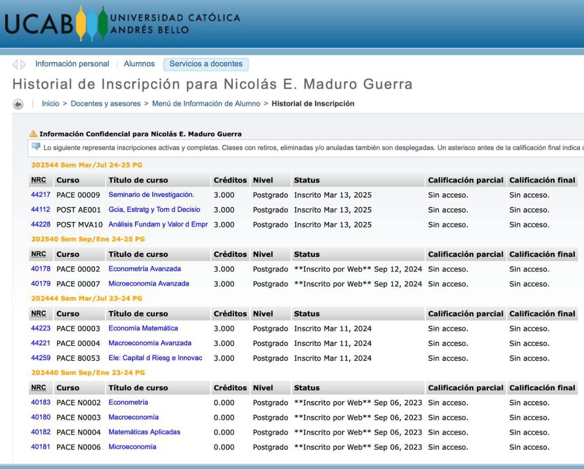 Las capturas del sistema académico de la UCAB muestran que Nicolás E. Maduro Guerra ha cursado asignaturas como Econometría Avanzada y Seminario de Investigación, sin haber reprobado ninguna materia. Sin embargo, lo más polémico es que recibe clases privadas en su residencia, a donde se desplazan los profesores, en violación directa del reglamento del doctorado, que exige presencialidad y equidad académica entre todos los estudiantes.