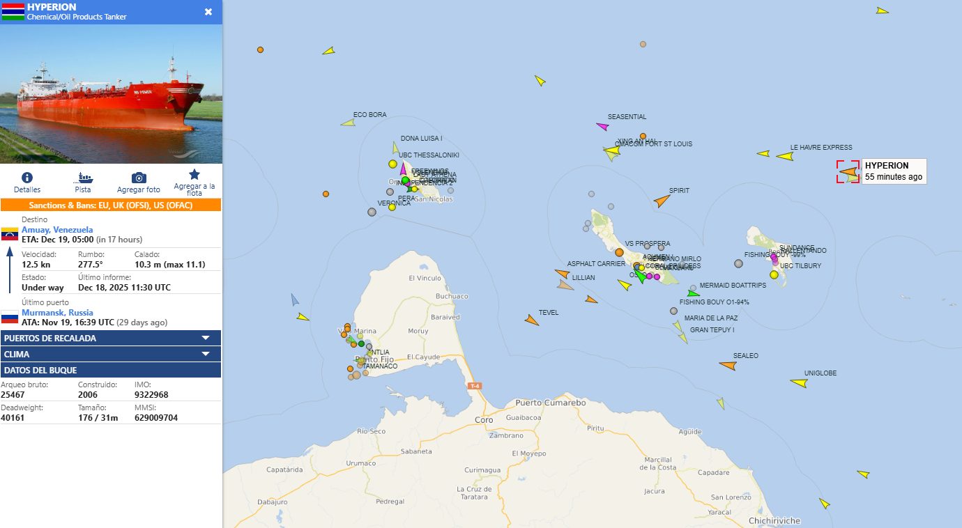 El tanquero ruso HYPERION intenta descargar diluyentes en algún puerto de Venezuela mientras el despliegue militar de Estados Unidos promete bloquear el ingreso y la salida de buques petroleros sancionados en el mar Caribe que estén relacionados con Pdvsa.