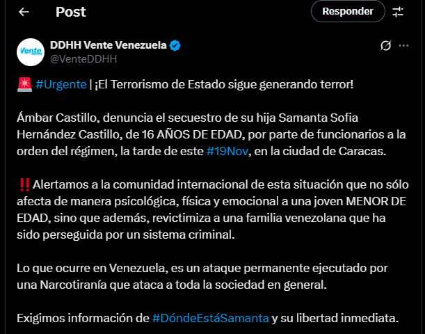 El Comité de Derechos Humanos del partido Vente Venezuela, difundió en su cuenta oficial de X un video en el que Ámbar Castillo denuncia el secuestro de su hija, Samantha Sofía Hernández Castillo, de 16 años, a manos de funcionarios de la Dirección General de Contrainteligencia Militar (Dgcim).