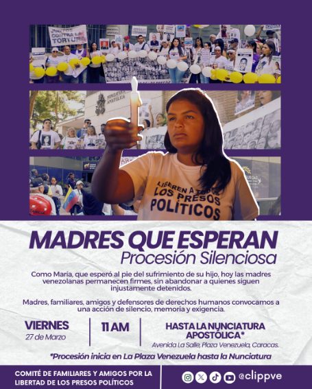 El Comité por la Libertad de los Presos Políticos en Venezuela (ClippVe) convocó a una procesión silenciosa para este viernes 27 de marzo en Caracas.