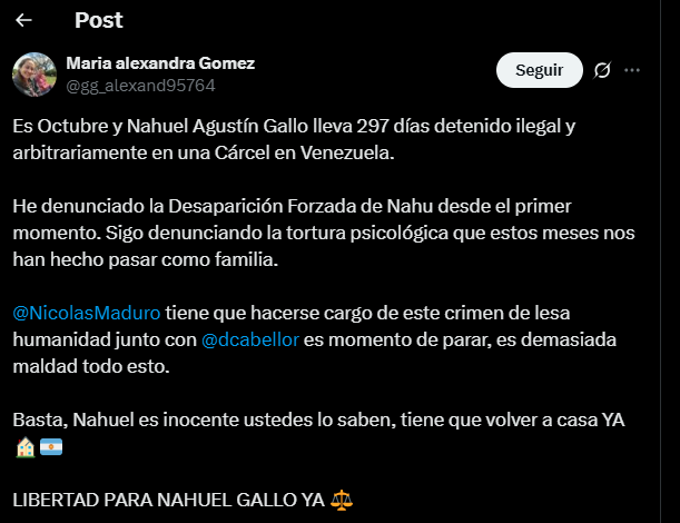 La esposa del gendarme argentino Nahuel Agustín Gallo, María Alexandra Gómez, denunció a través de su cuenta oficial de X la detención ilegal y arbitraria de su esposo en Venezuela, que ya alcanza los 297 días.