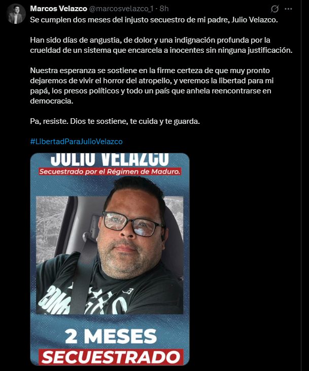 “Se cumplen dos meses del injusto secuestro de mi padre, Julio Velazco. Han sido días de angustia, de dolor y una indignación profunda por la crueldad de un sistema que encarcela a inocentes sin ninguna justificación. Nuestra esperanza se sostiene en la firme certeza de que muy pronto dejaremos de vivir el horror del atropello, y veremos la libertad para mi papá, los presos políticos y todo un país que anhela reencontrarse en democracia. Pa, resiste. Dios te sostiene, te cuida y te guarda. #LibertadParaJulioVelazco”, escribió el dirigente opositor.