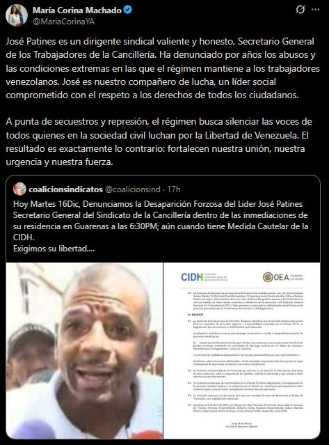 Las declaraciones de Machado se producen después de que la Coalición Sindical Nacional de Trabajadores de Venezuela denunciara la desaparición forzada de Patines el pasado martes 16 de diciembre, en las inmediaciones de su residencia en Guarenas, estado Miranda, alrededor de las 6:30 pm, cuando el dirigente contaba con medidas cautelares otorgadas por la Comisión Interamericana de Derechos Humanos (Cidh).
