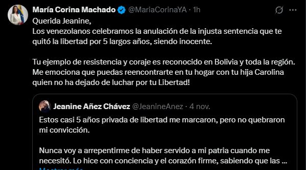En un mensaje publicado en su cuenta oficial de X (antes Twitter), Machado expresó su alegría por la liberación de Añez, a quien calificó de “inocente” y ejemplo de resistencia en América Latina.