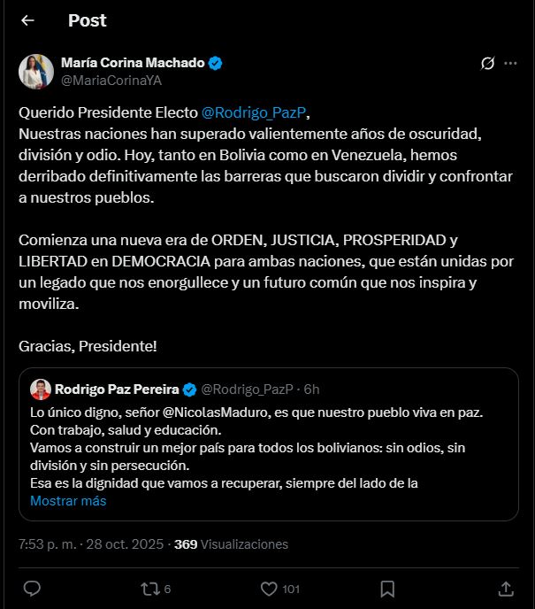 La líder de las fuerzas democráticas de Venezuela, María Corina Machado, celebró este martes 28 de octubre la elección de Rodrigo Paz Pereira como presidente de Bolivia, y le dedicó un mensaje en su cuenta oficial de X (antes Twitter) en el que destacó la unión entre ambos pueblos en la lucha por la libertad y la democracia.