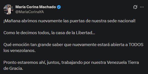 A través de una publicación en su cuenta de X, Machado celebró que la base de la organización política abrirá nuevamente sus puertas. Además, aseguró que pronto acompañará a toda la dirigencia para trabajar por el país.