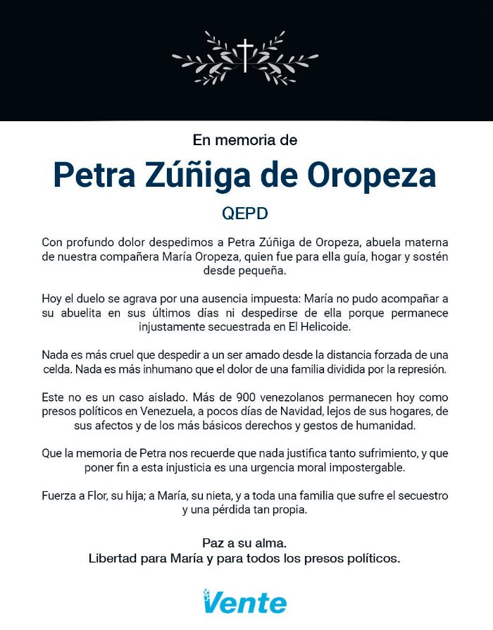 «Hoy abrazamos a toda la familia Oropeza y a nuestros compañeros de Guanare, y compartimos su dolor por la partida de Petra, la adorada abuelita ‘Maita’ de María. AFlor, la mamá de María, a Luisanny, su hermana menor, y a mi querida y valiente María, presa en El Helicoide, les enviamos nuestras oraciones y nuestro infinito amor», expresó Machado en sus redes sociales.