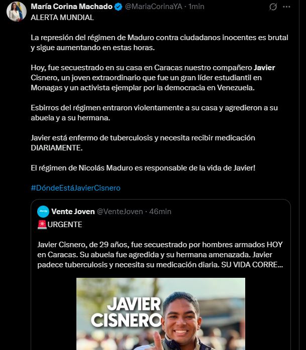 La líder de las fuerzas democráticas de Venezuela y Premio Nobel de la Paz, María Corina Machado, alertó este viernes 24 de octubre sobre el secuestro de Javier Cisnero, un joven activista y líder estudiantil de 29 años, en su residencia en Caracas.