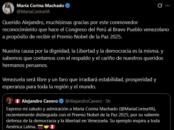 “Muchísimas gracias por este conmovedor reconocimiento que hace el Congreso del Perú al Bravo Pueblo venezolano a propósito de recibir el Premio Nobel de la Paz 2025. Nuestra causa por la dignidad, la Libertad y la democracia es la misma, y sabemos que contamos con el respaldo y el cariño de nuestros queridos hermanos peruanos”, afirmó.
