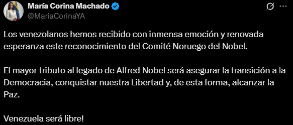 «El pueblo venezolano ha recibido este reconocimiento del Comité Noruego del Nobel con inmensa emoción y renovada esperanza», dijo la exdiputada en un mensaje publicado en inglés en la red social X.