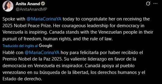 Más temprano, la ministra Anita Anand felicitó a María Corina Machado por ganar recientemente el Premio Nobel de la Paz 2025 y elogió su liderazgo en favor de la democracia.